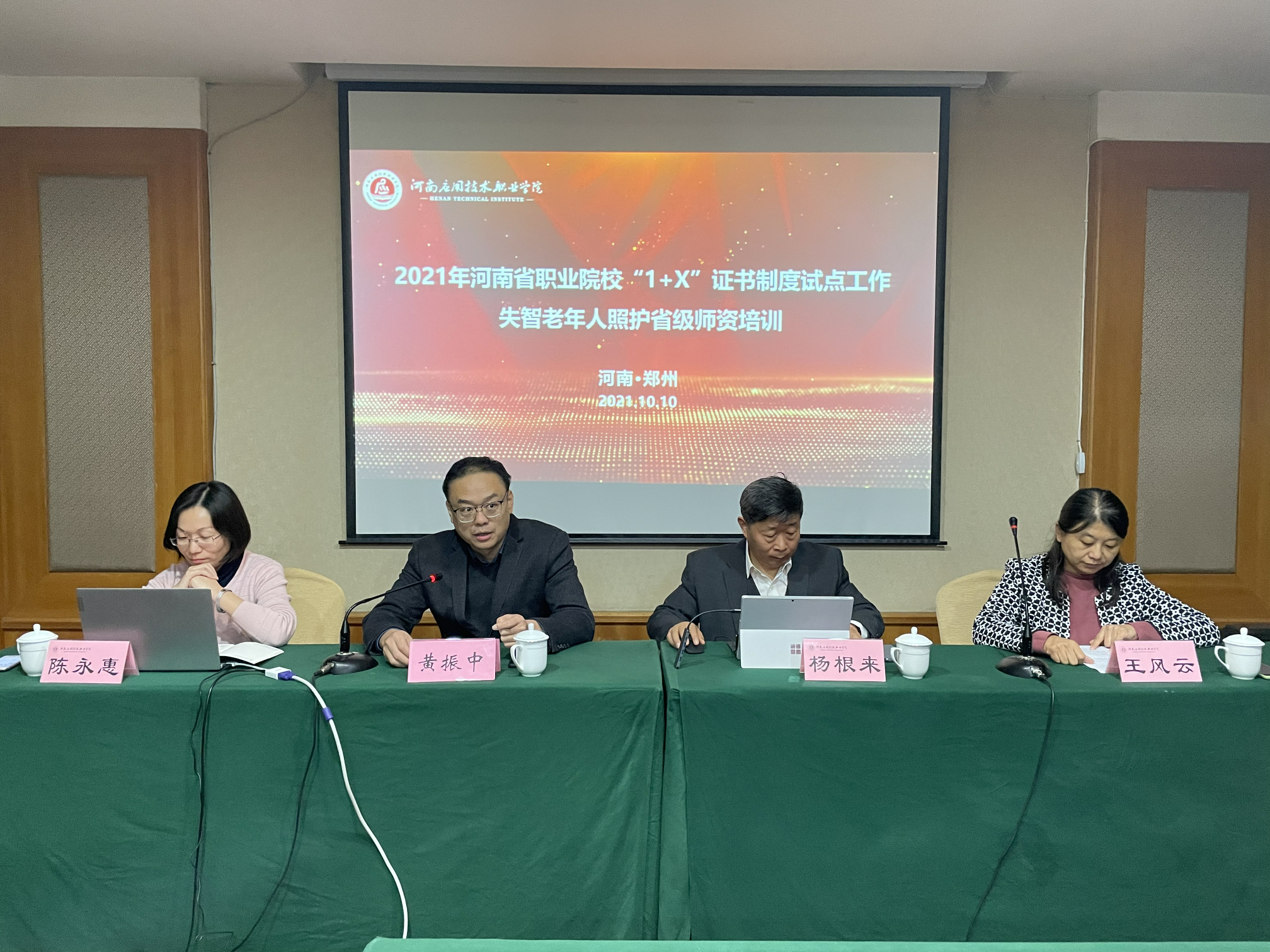 为贯彻落实《国家职业教育改革实施方案》精神,推进职业技能等级证书试点工作,2021年10月10日,2021年河南省职业院校“1+X”失智老年人照护省级师资培训班开班仪式在嵩阳饭店举行,北京中民福祉科技有限公司总经理杨根来、Beat365官方网站教务处处长黄振中、护理学院院长王风云、护理学院副院长陈永惠以及来自省内各高职院校的教师学员参加此次开班仪式。仪式由陈永惠主持。