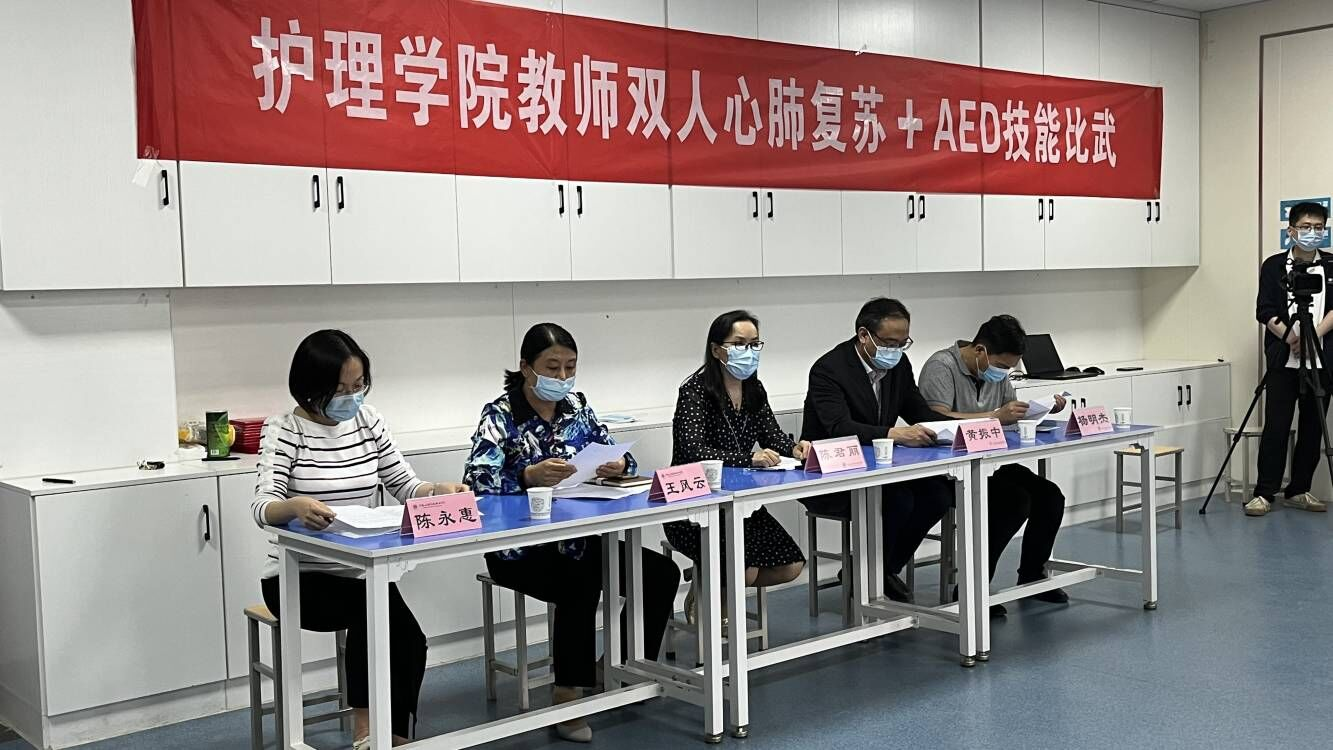 为贯彻全国职业教育大会精神,深化职业教育教学改革,进一步提升护理学院教师职业能力和工作水平,4月27日下午,护理学院在护理实训楼D404开展教师双人心肺复苏+AED技能比武。比赛特邀校外相关领域3位专家担任线上评委打分,副校长陈君丽、教务处处长黄振中、护理学院党总支书记杨明杰、护理学院院长王风云、副院长陈永惠现场观摩比赛。