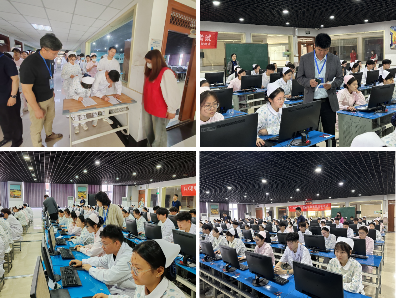 本次考证采取理论机考和现场实操两种形式。学生在完成理论考试后,经过候考、抽题、物料准备、进入考场等流程后进行实操考试。专家考评员根据考生的现场操作情况,对考生进行综合评价。护理学院院长王风云到场巡考,老年保健与管理教研室全体教师参与考务工作。
