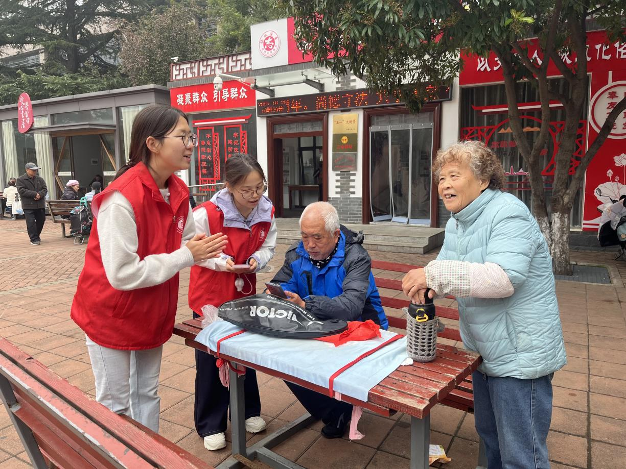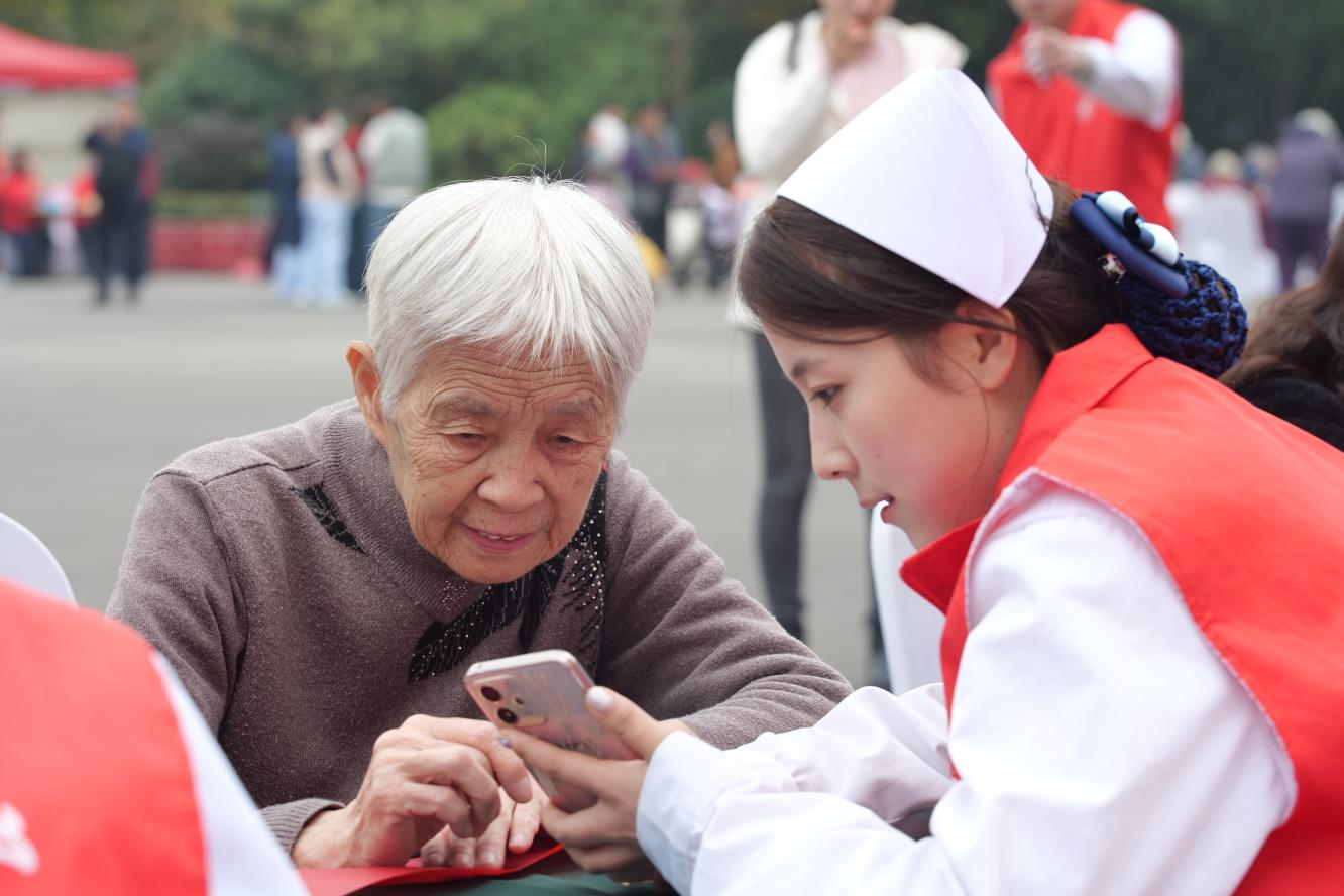 10月28日,在郑州市五一公园的活动现场,红灯笼与老年朋友们的笑脸相映成趣。我院志愿者们早早搭建起 “智慧助老服务处”,通过悬挂宣传海报、现场一对一讲解等形式,吸引了大批老人驻足咨询。“奶奶,您看,点击这个绿色图标就能和子女视频通话啦,还能放大看清楚脸呢!”志愿者一步步演示视频通话的操作步骤,从解锁屏幕、找到应用、到拨号连接、调节音量,每个细节都讲解得细致入微。