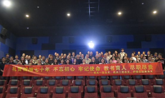 为庆祝中华人民共和国成立70周年华诞,深入贯彻落实党的十九大精神和习近平总书记在“不忘初心、牢记使命”主题教育工作会议上的重要讲话精神。10月10日晚,Beat365官网机关一党总支、机关二党总支和护理学院党总支结合“不忘初心、牢记使命”主题教育,组织全体党员100余人参加“我和我的祖国”集体观影活动。
