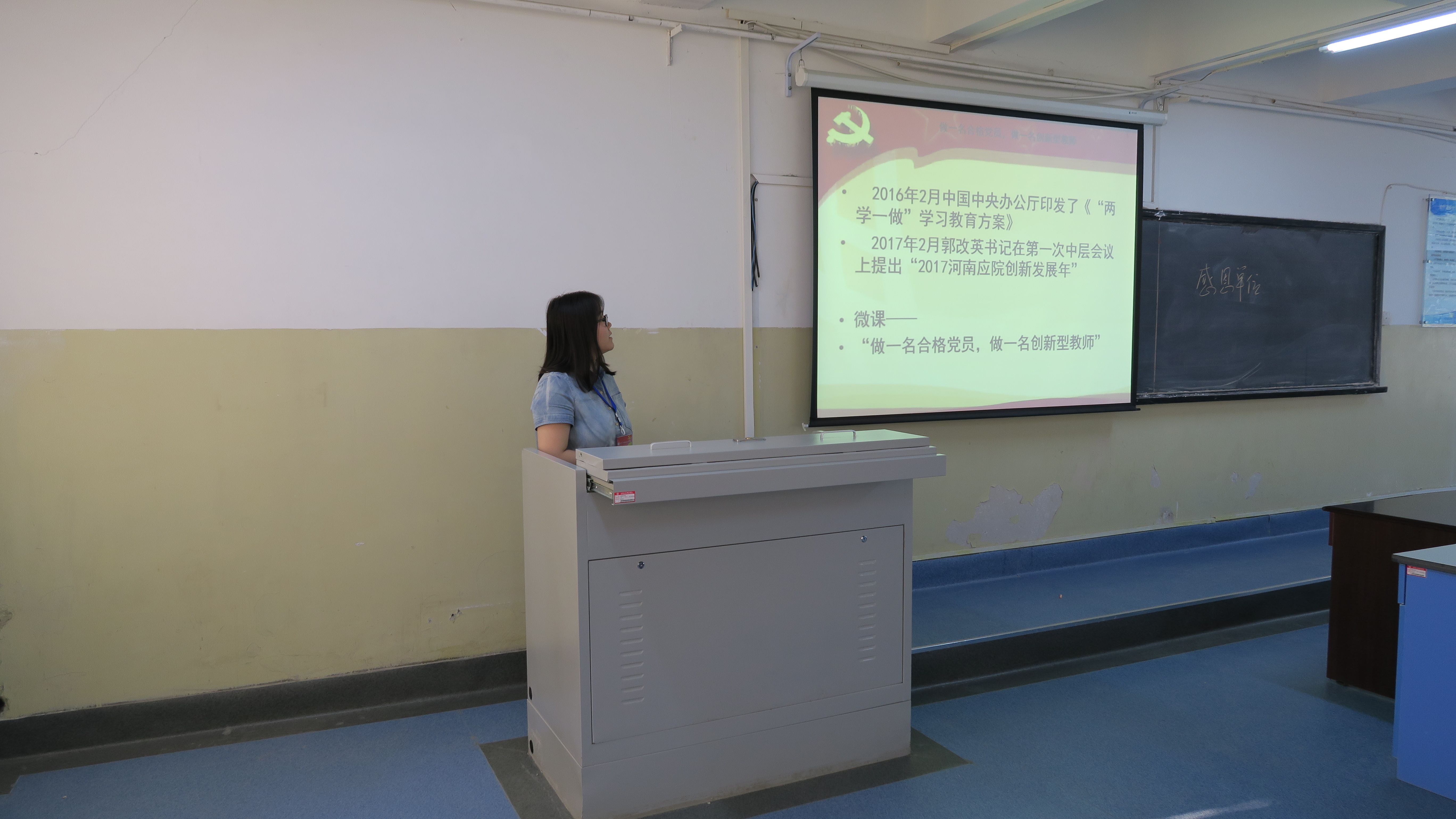2016年2月中共中央办公厅发出《两学一做》学习教育方案,各地区各部门认真贯彻执行;2017年2月郭改英书记在第一次中层会议上提出2017为Beat365官网创新发展年,景淼同志以“做合格党员,做创新型教师”为授课主题。