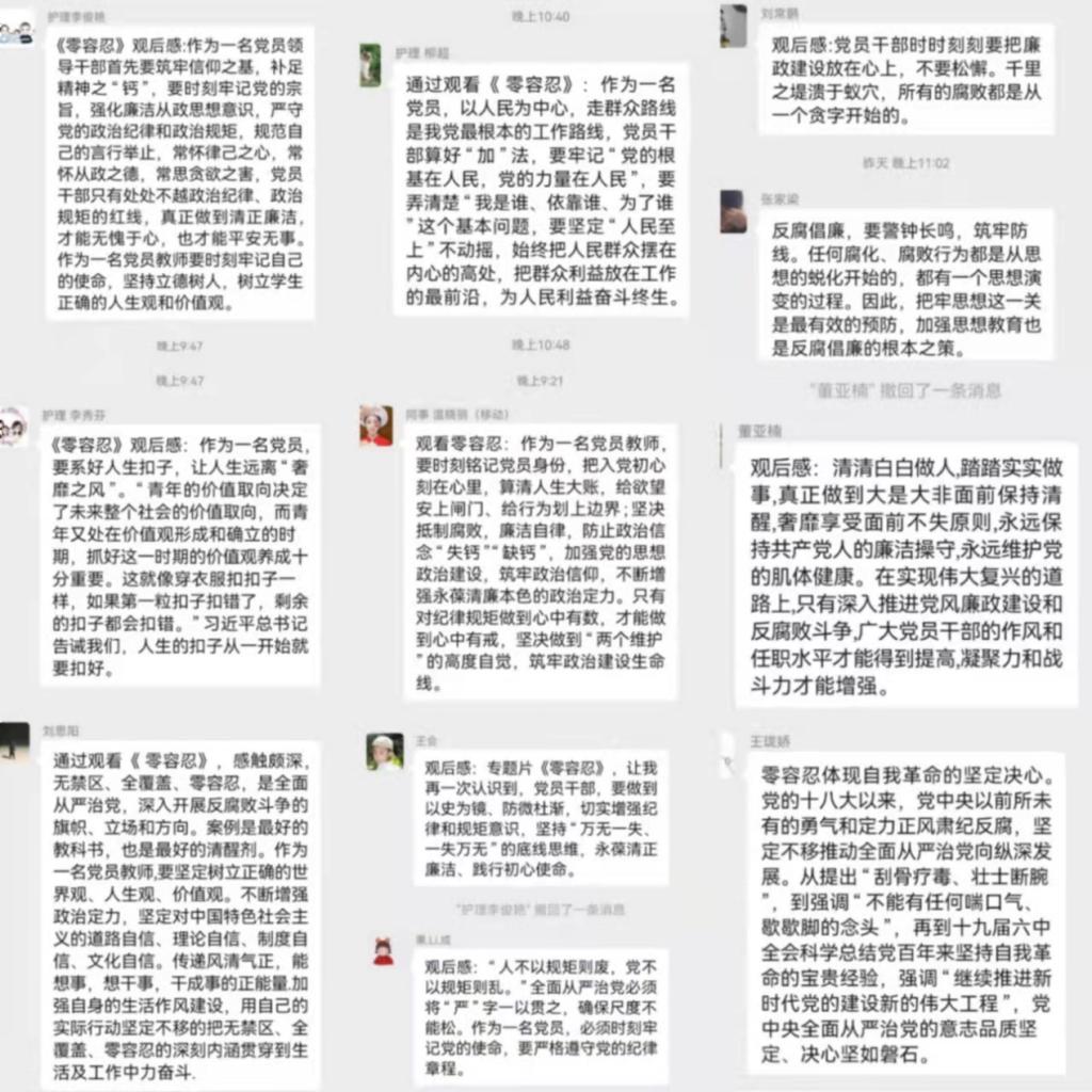 观看结束后,全体党员纷纷在护理学院党总支群内发表了观后感言。大家一致觉得必须坚定理想信念,筑牢思想防线,树立并保持正确的三观,坚决以一名共产党员的党性修养做好教育事业,以党的事业、集体的利益为重,经得起诱惑,保持足够的定力和操守,时刻警惕被腐蚀。