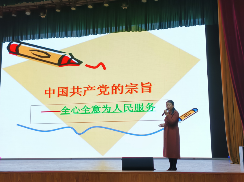 党课以《永不褪色的旗帜,指引航向的灯塔》为主题,内容以党的性质,党的宗旨,党的基本路线为主线,指出全心全意为人民服务,是党一切工作的出发点和落脚点,是党的根本宗旨。人民立场是党的根本立场,要坚持党的群众路线,坚持以人民为中心,才能在中国特色社会主义道路上奋勇前进。并要求学员们增强入党的自觉意识,提高理论水平,端正入党动机,坚定理想信念。
