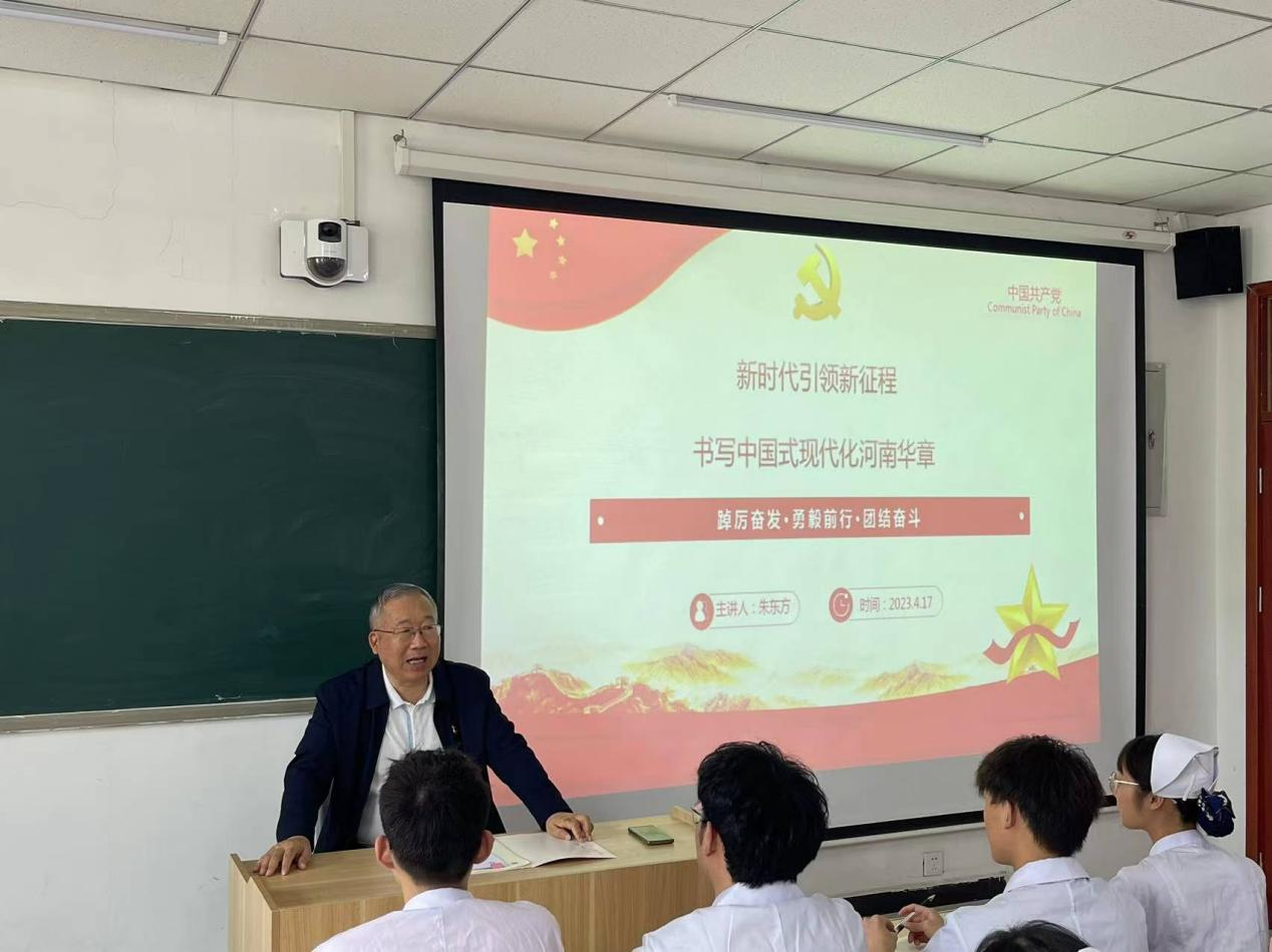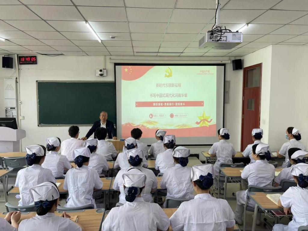为深入学习贯彻党的二十大精神,坚持学思用贯通、知信行统一,引导并鼓励广大师生坚定文化自信,为建设社会主义文化强国作出更大贡献,4月17日,Beat365官网党委副书记朱东方以“新思想引领新征程 书写中国式现代化河南华章”为主题,为护理学院学生上了一堂精彩生动的思政课。