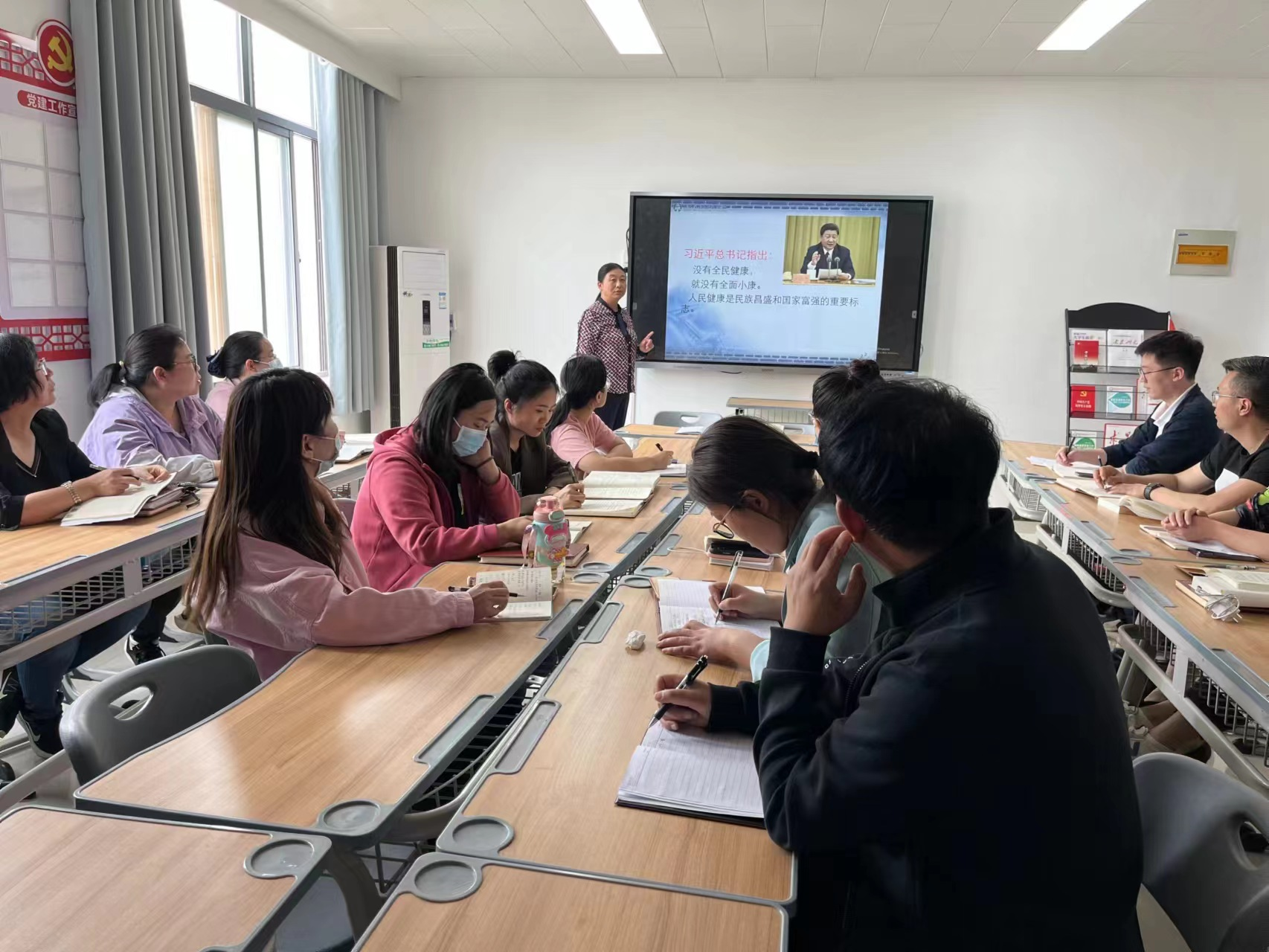 59日,护理学院党总支教工党支部在A515党员活动室召开学习健康中国战略主题教育集体学习研讨会,围绕习近平总书记的讲话“没有全民健康,就没有全面小康”。人民健康是民族昌盛和国家富强的重要标志”开展学习研讨交流。学习研讨会由护理学院党总支教工党支部书记王风云主持。