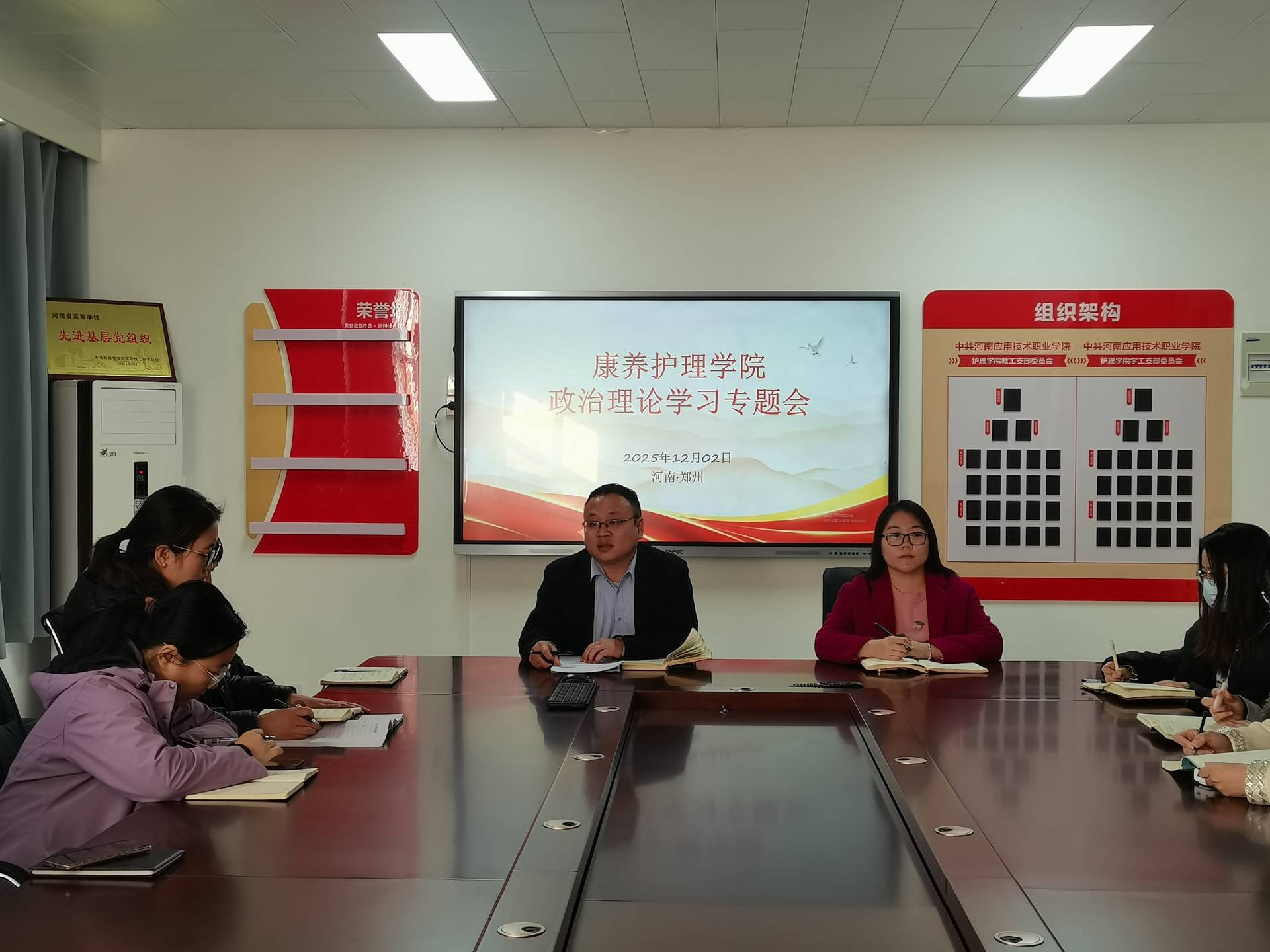随后,与会人员共同学习了《中国共产党河南省第十一届委员会第十次全体会议公报》(2025年11月29日)。张忠勇结合学院发展实际,解读了河南省在推进高质量发展、民生保障等领域的重点任务,要求教职工主动对接地方需求,在康养产业升级、社区健康服务等领域深化校企合作,以实际行动践行省委全会精神。