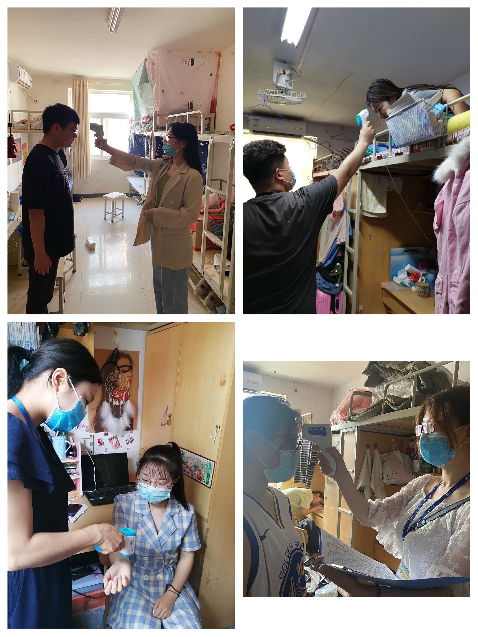 学生到达学生公寓后,保持1.5米间距排队接受检查。宿管人员会查验学生身份并测量体温,并对行李进行二次消杀。身份查验合格,体温检测正常后,学生有序进入寝室。