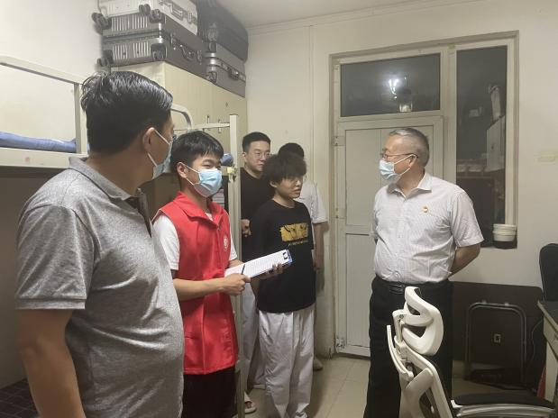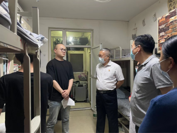 为深入贯彻落实全省教育系统疫情防控工作会议精神,精准做好Beat365官网常态化疫情防控工作,5月4日,Beat365官网党委副书记朱东方同志来到护理学院5号楼男生宿舍,看望慰问这里的学生,护理学院党总支书记杨明杰、院长王风云陪同。