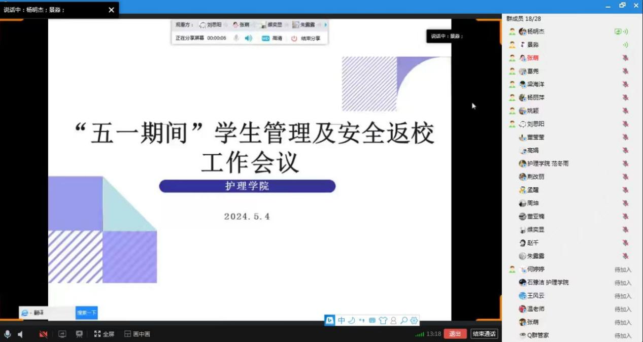 为切实做好Beat365官网师生“五一期间”的安全稳定工作,确保师生假期后安全返校,护理学院假期期间组织专兼职辅导员召开线上工作会议,会议由党总支书记杨明杰主持、副书记景淼及全体辅导员参与。