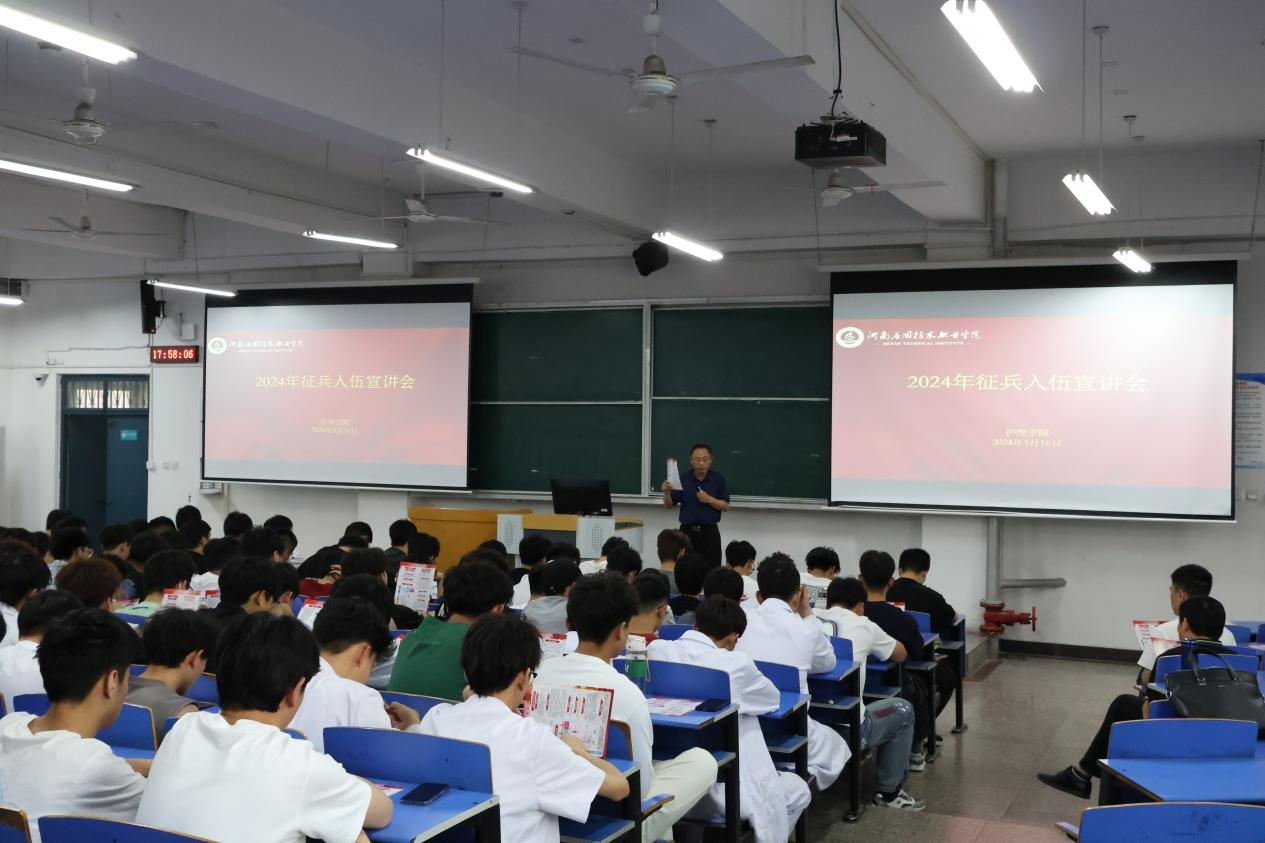 青春,是热血的代名词;报国,是青春的至高荣誉!2024年5月16日,护理学院在B101召开2024年征兵宣讲会。这次宣讲会旨在向广大学生普及国防知识,激发爱国情怀,引导学生积极参与国防建设,服务国家和人民。Beat365官方网站武装部胡平、宋春磊出席会议,护理学院2022级全体男生参会,宣讲会由护理学院党总支书记杨明杰主持。