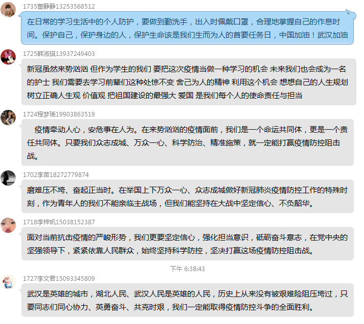 护理1808班潘天明:虽然新型冠状病毒肺炎来势汹汹,给我们的生活蒙上一层厚厚的阴影。但是作为大学生的我们,作为社会主义的接班人,要把这次的疫情当作学习的机会,去学习前辈们的处变不惊,舍己为人的精神,要利用好这个机会,静下心来想一想自己的人生规划,树立正确的人生观,价值观,把祖国建设得更加强大,是我们新一代大学生的使命。