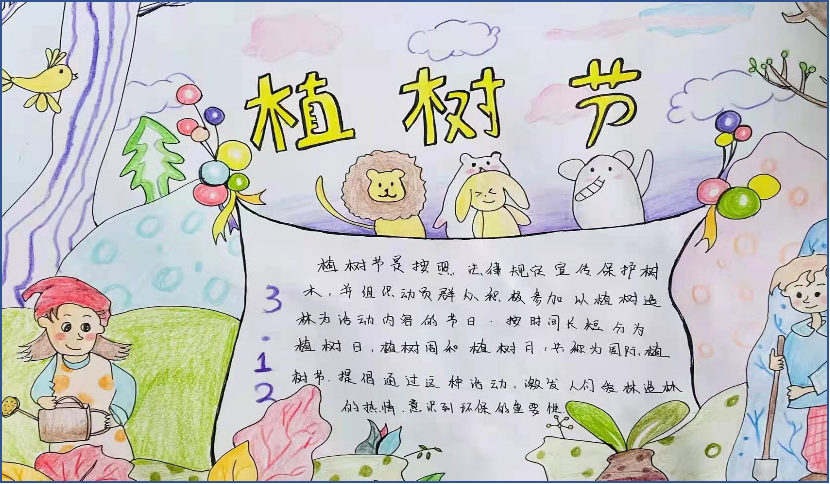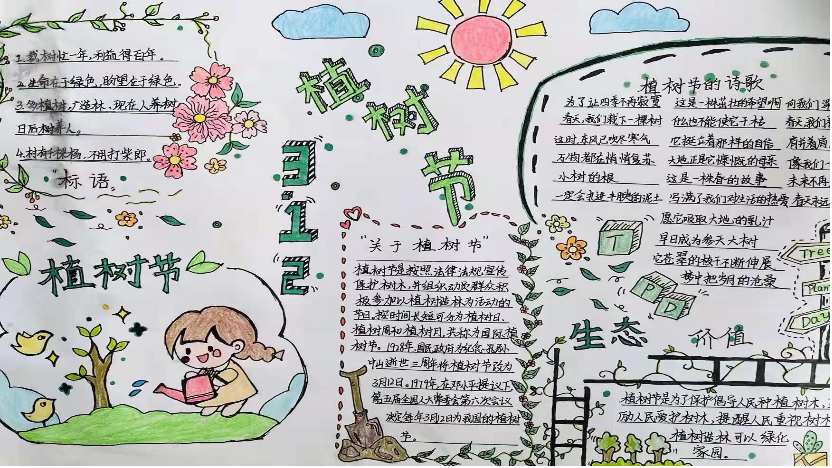 活动以制作展板和手抄报两种形式开展,各班级踊跃参与,选出优秀作品张贴在展示栏中进行展出。展板及手抄报的制作,从确定主题到设计排版;从绘画到书写,都各具特色。一个个绿色小使者通过自己手中的画笔,既发出了爱绿、护绿的倡议,同时也在这美丽的季节里描绘出了心中美好的憧憬,播撒下了绿色的种子,希望的种子。