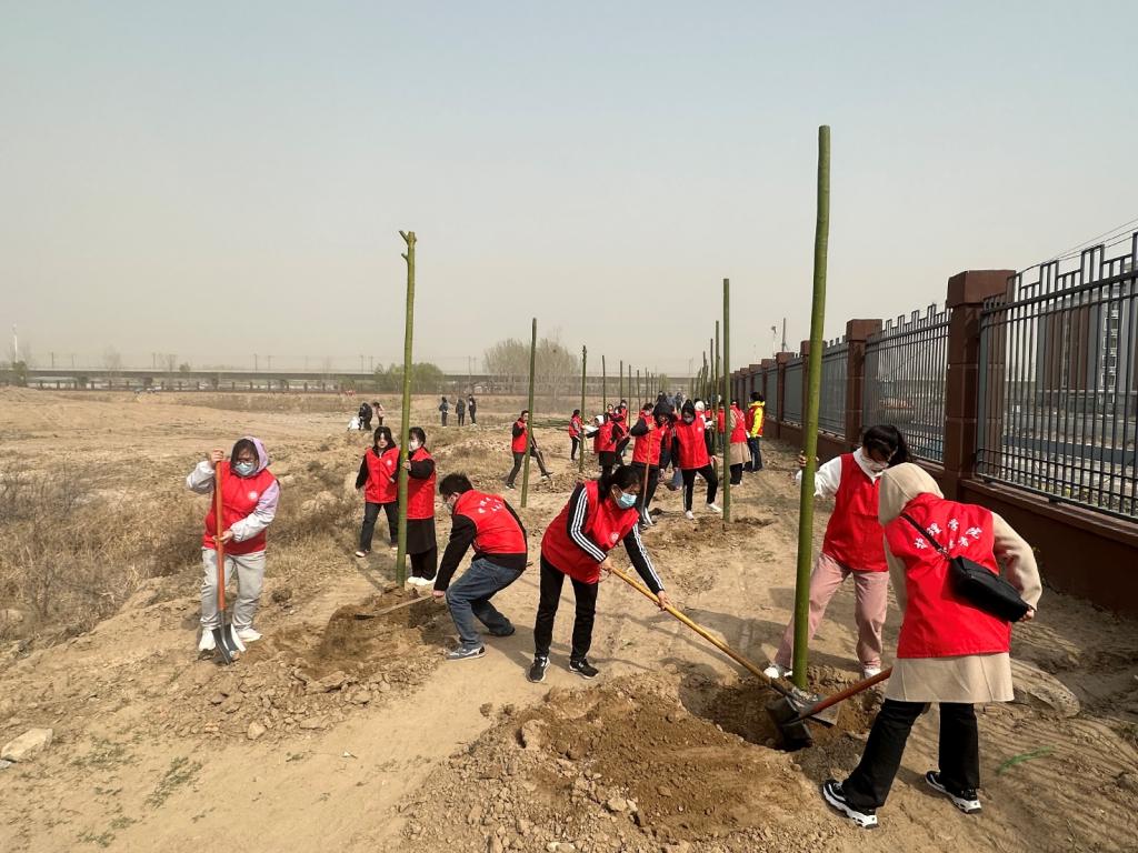 2023年3月11日上午8点,在学院领导的带领下,大家乘车到达新校区后,不顾旅途的劳累,顶着巨大的风沙,兴致盎然奔走在各处植树区域。大家分工明确,各司其职,入坑栽种,填充土壤,浇水定根,合计完成植树十九棵。