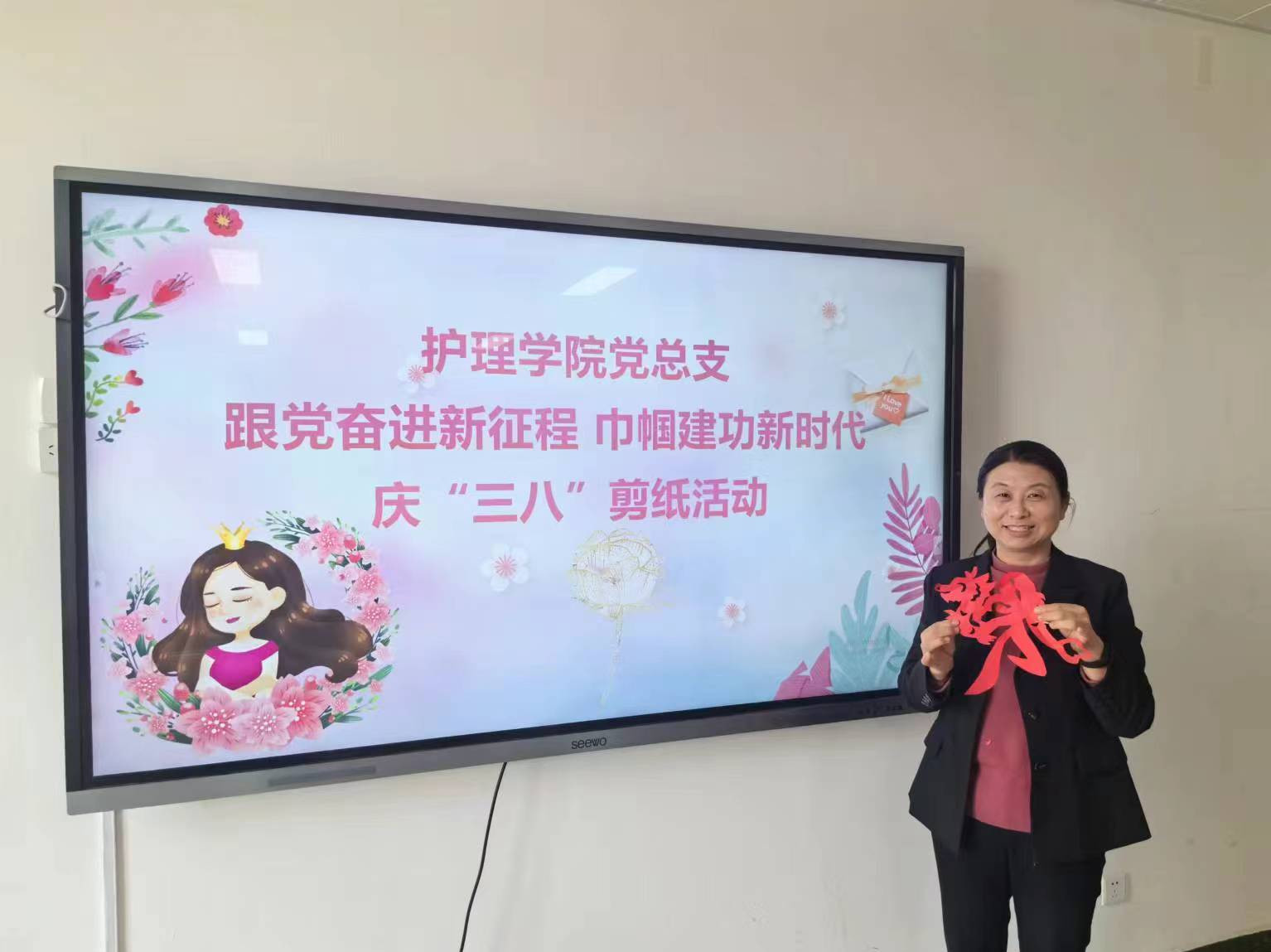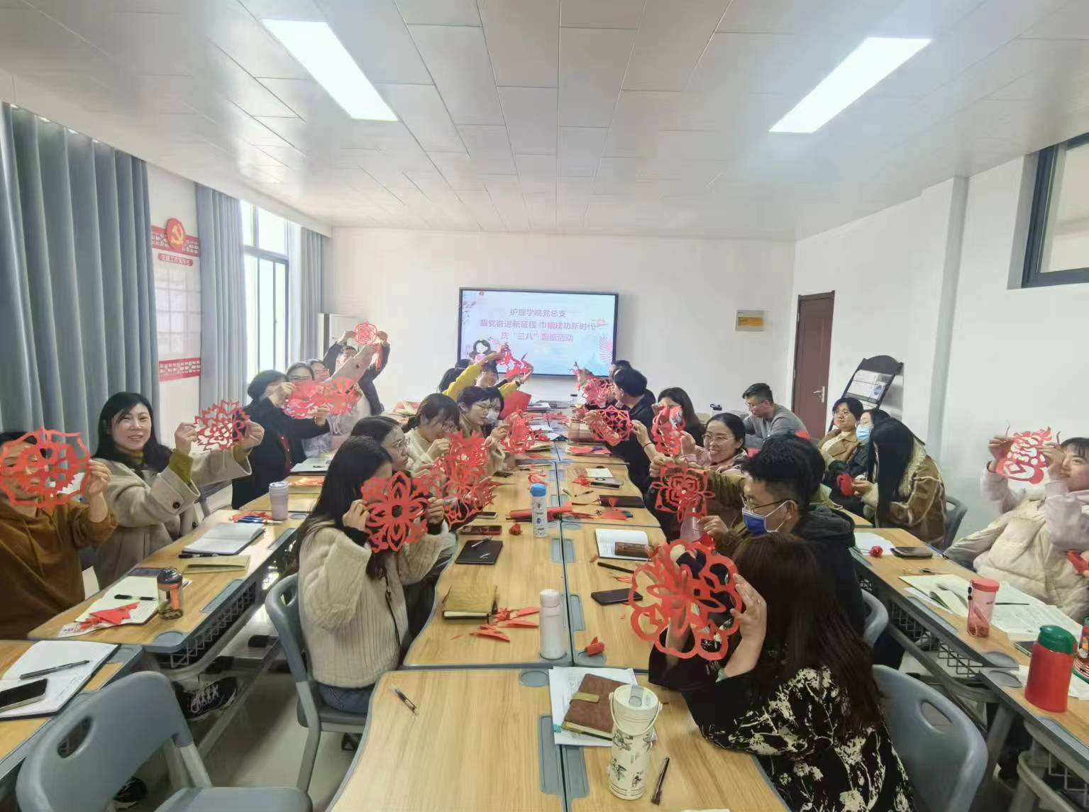 三月春晖争芳菲,巾帼花开别样红。为庆祝“三八”国际劳动妇女节,丰富教职工课余文化生活,营造温馨和谐的校园氛围,3月12日,护理学院分工会举办“跟党奋进新征程 巾帼建功新时代”庆“三八”剪纸活动。党总支书记杨明杰主持并为学院女教工送上了节日的问候和美好的祝福。