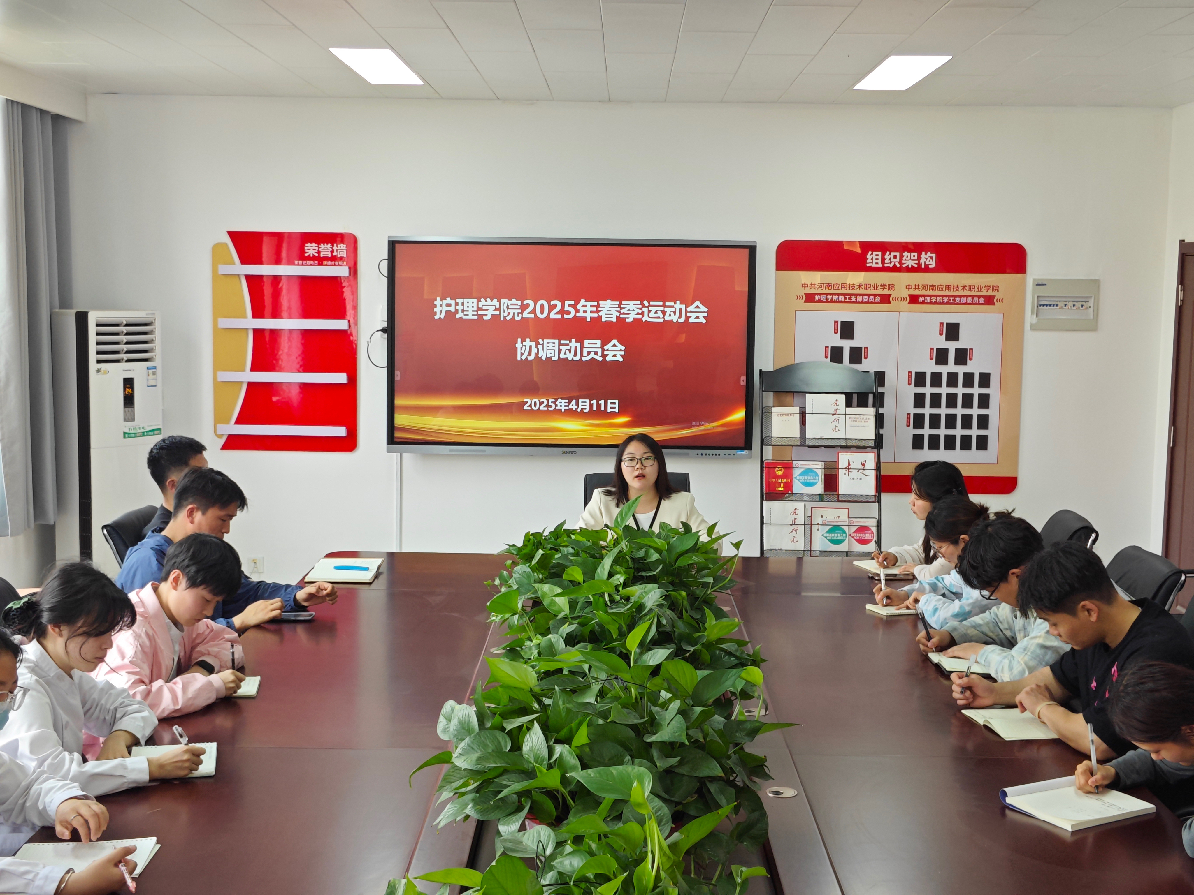 为全面保障护理学院顺利完成Beat365官网2025年春季运动会的各项工作,充分调动学生参与的积极性,确保各项工作及后勤保障高效有序推进,护理学院于4月11日在A515召开2025年春季运动会协调动员会。学院党总支副书记景淼主持会议、辅导员及团学会各部门负责人参加会议,共同部署运动会筹备工作。