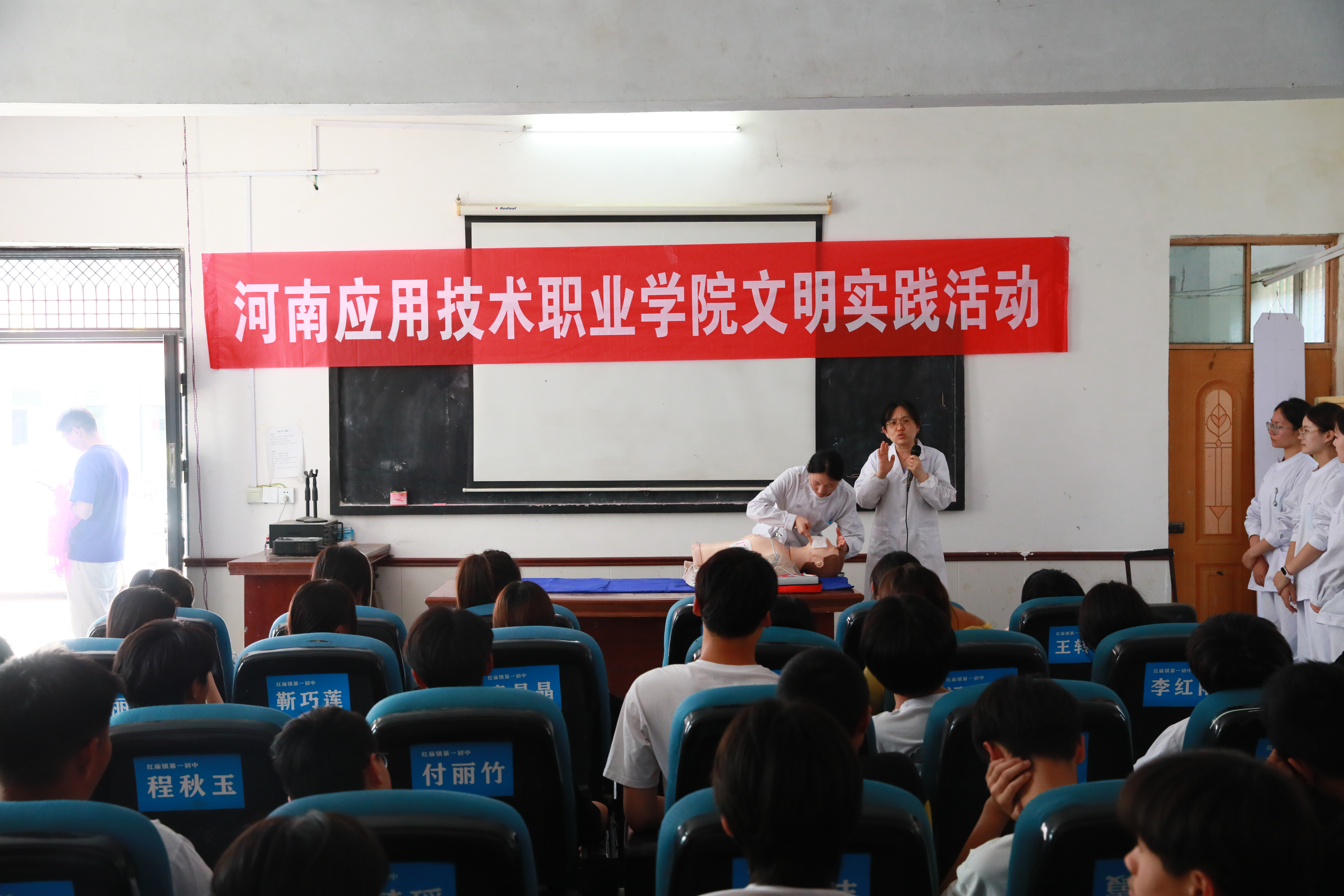 下午,护理学院师生代表到红庙镇第一初中开展健康科普讲座,为中学师生进行急救培训。讲座重点讲解了心肺复苏、海姆立克急救法等实用技能以及日常健康知识。通过技能展示、操作指导以及答疑解惑等环节,现场气氛活跃、师生学习热情高涨。“以前只在电视上看过急救,今天终于学会怎么救人了!”参与培训的一名学生表示。